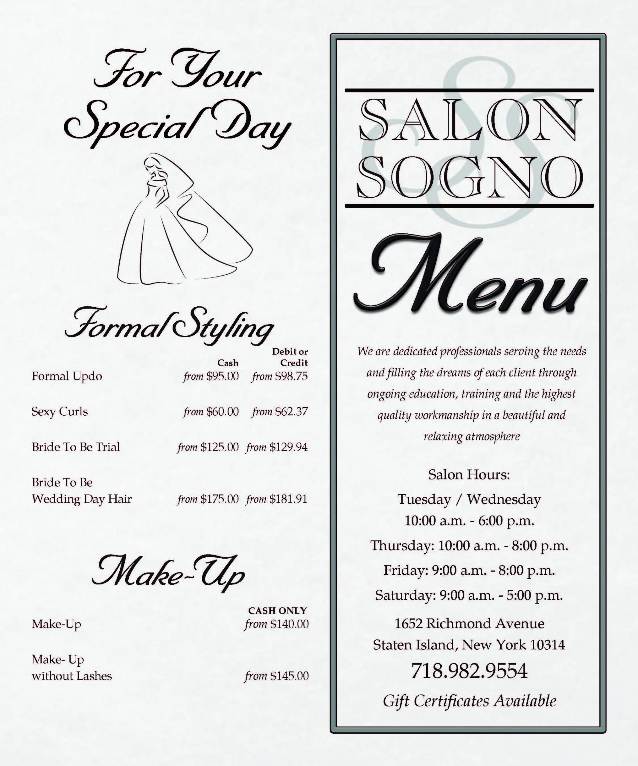 We offer a variety of services to help you look and feel your best. From hair to makeup to special events, let Salon Sogno work for you and have some fun.